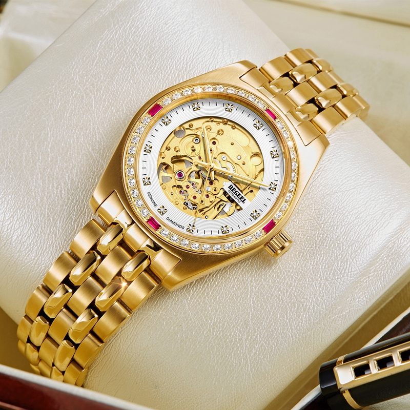 表殼:白鉆圈-316L精鋼電鍍金,紅鉆圈-316L精鋼電鍍金,鑲40顆晶鉆,4顆紅方晶鉆