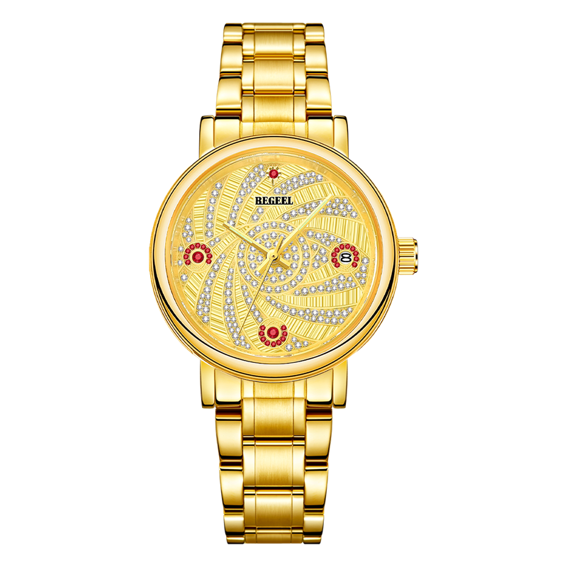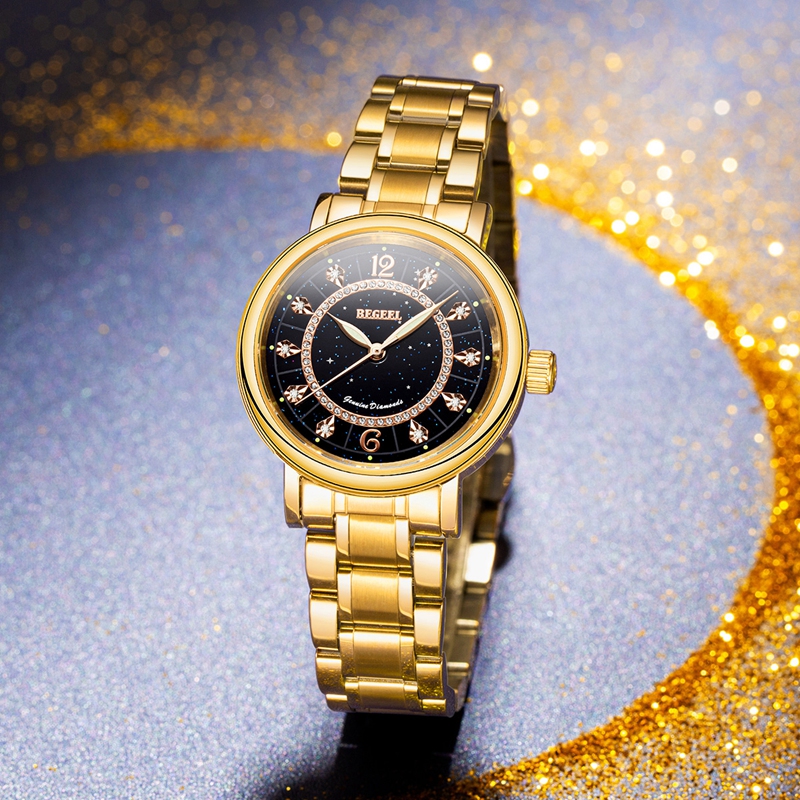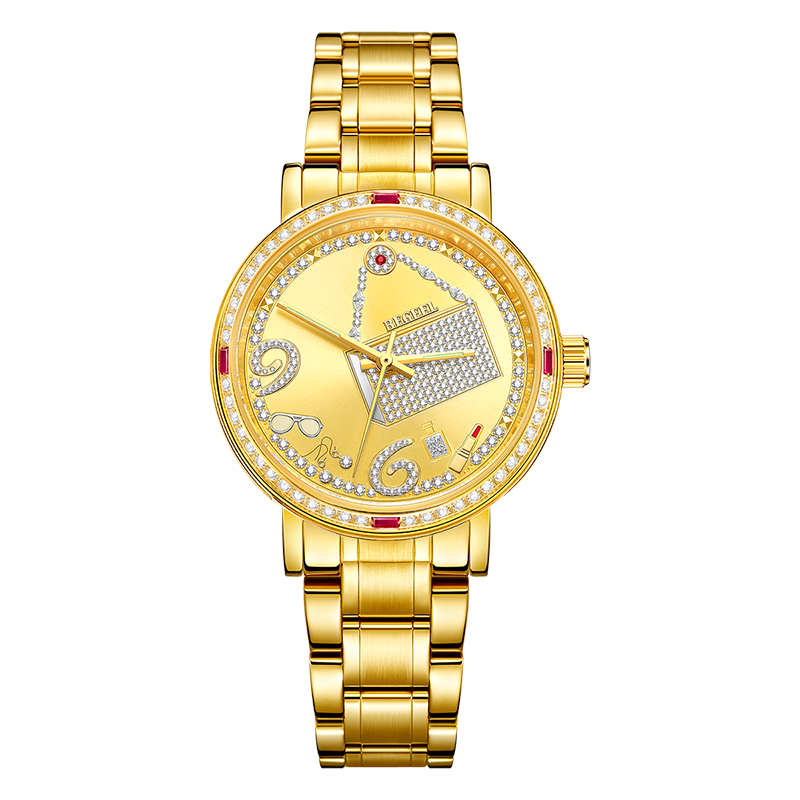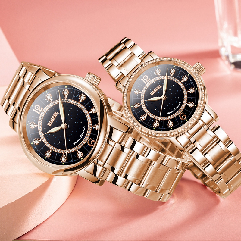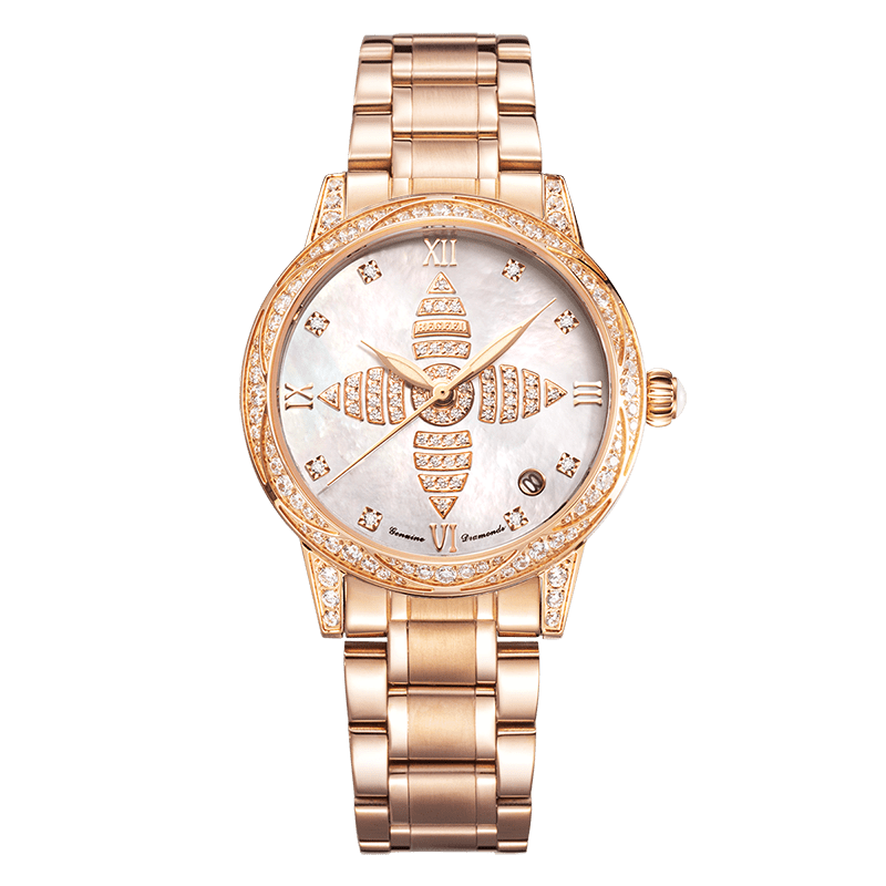 表殼:316L精鋼電鍍玫瑰金/316L精鋼電鍍真金,女款鑲65顆晶鉆