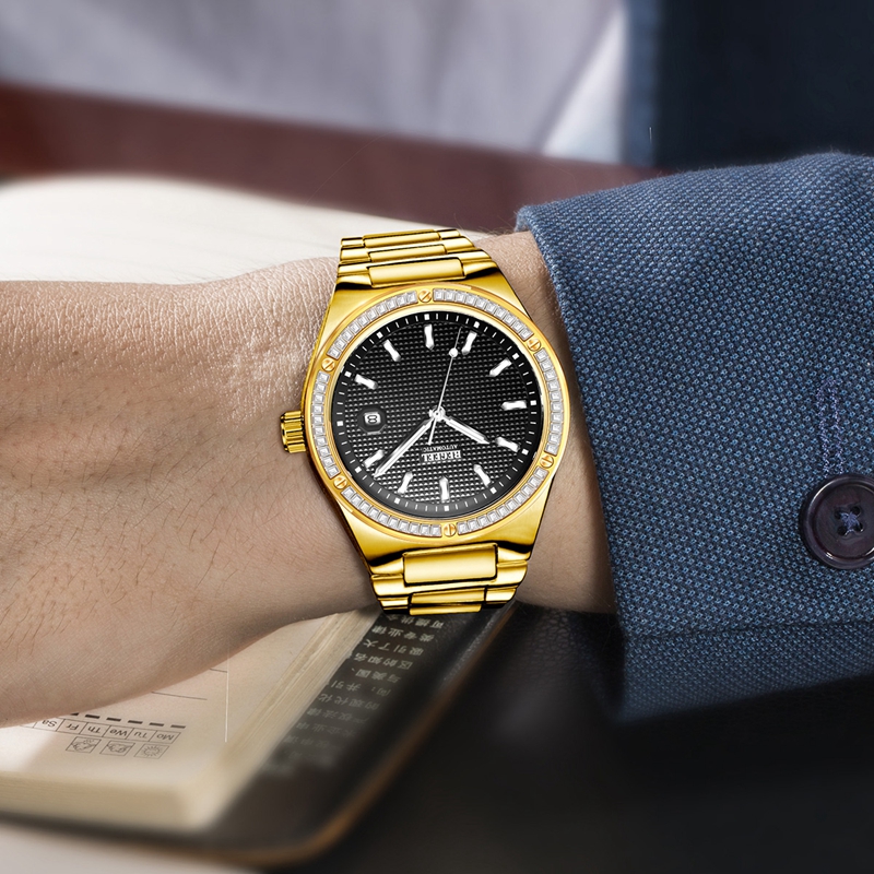 表殼:316L精鋼(電鍍真金)/間金,圈口鑲60顆晶鉆方石