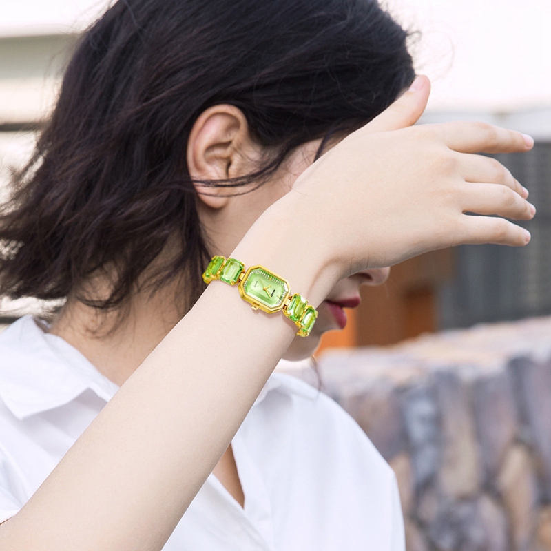 以沙弗萊石與鍍金工藝呈現(xiàn)細(xì)膩柔美的女性魅力,清新亮麗的薄荷綠太陽紋盤面,交疊成淡雅清新的薄荷糖環(huán)繞于腕間,如夢似幻。